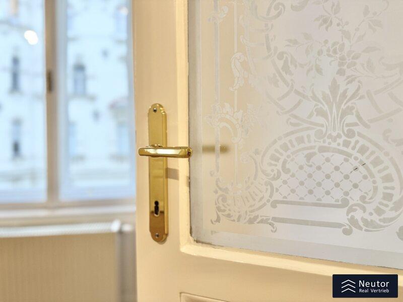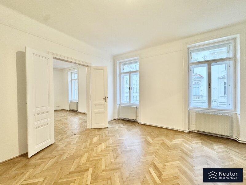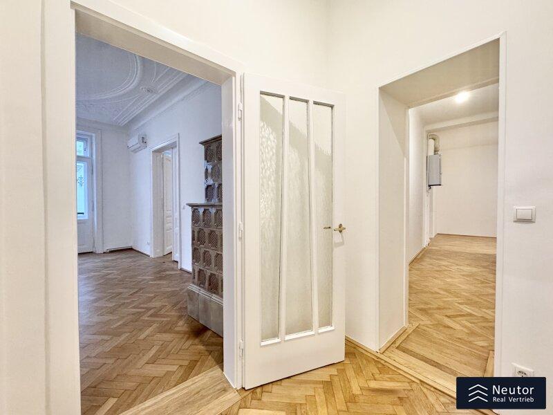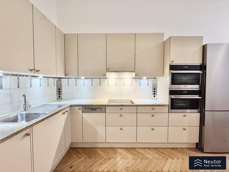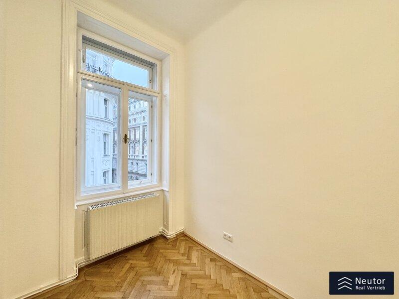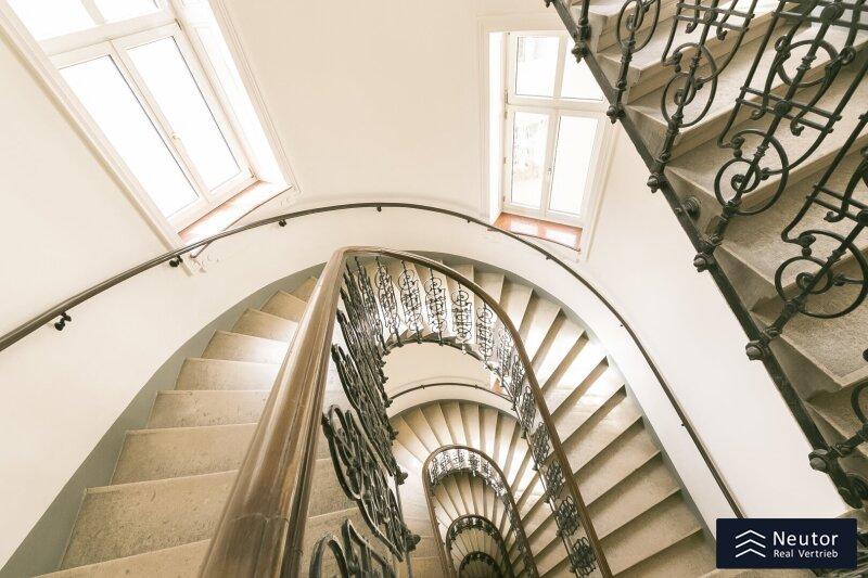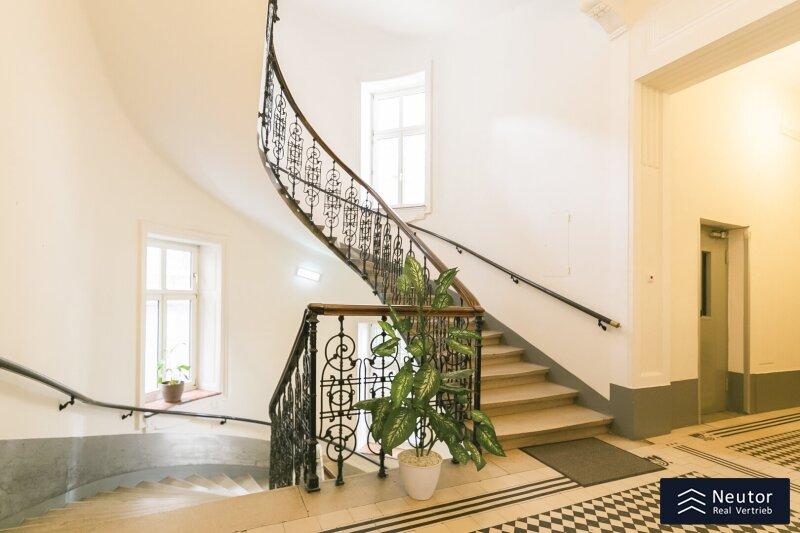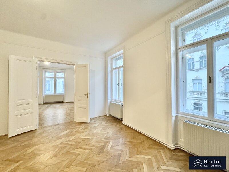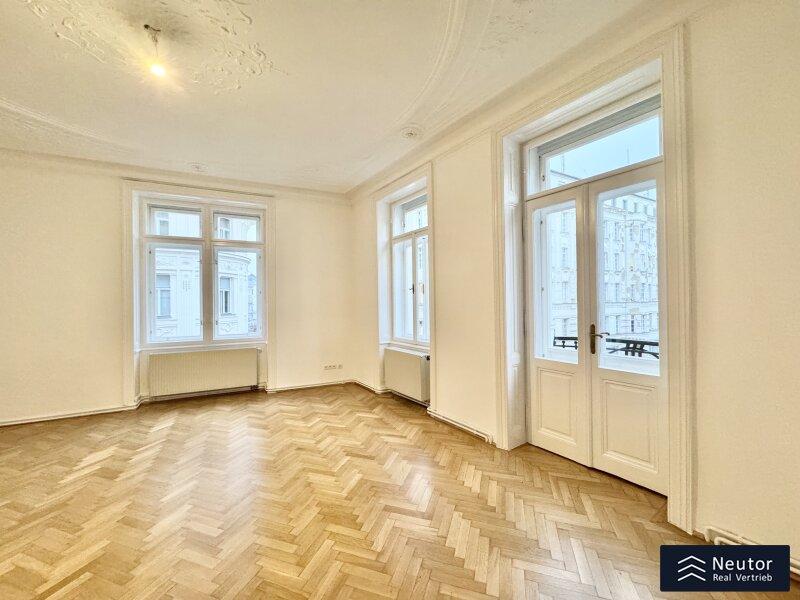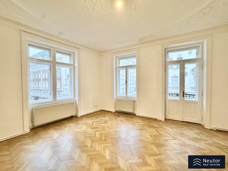 Das Staunen beginnt bei diesem Stilaltbau bereits vor der reich gegliederten Fassade und dem repräsentativen Eingangsbereich, welcher sich im wunderschönen Originalzustand präsentiert. Bequem gelangen Sie per Lift in das 2. Regelgeschoss, von welchem aus Sie nur mehr wenige Schritte von der großzügigen 4-Zimmerwohnung trennen. Die Wohnung wurdevor wenigen Jahren aufwendig teilsaniert und revitalisiert und besticht durch edlen Fischgrätparkett, welcher nahtlos durch die Räume verlegt ist, Kassettentüren, hohe Räume, alles Stilelemente was einen schönen Altbau ausmachen. Sie betreten Ihre neue Wohnung über einen großzügigen Vorraum, welcher ausreichend Platz für eine Garderobe bietet. Von diesem aus gelangen Sie in das Kabinett und zur Küche. Ebenso erreichen Sie das separate WC sowie dem kompakten Badezimmer mit Dusche. Die Einbauküche wurde separat angelegt und lädt förmlich zum Kochen ein. Diese wurde mit Marken-Geräten ausgestattet und kann ebenso mit einem kleinen Balkon punkten - beeindruckenden Ausblick auf den tiefen Graben und die Wipplingerstraße inklusive. Kreisförmig angelegt, erreichen Sie weiteren Räume dieser 4 Zimmerwohnung. Blickfang garantiert im Eck-Wohnzimmer der große formschöne Kachelofen, der in den Wintermonaten eine wohlig warme Wärme in diesen Wohntraum zaubert. Im Sommer hilft Ihnen die installierte Klimaanlage im Wohnzimmer einen kühlen Kopf zu bewahren. Eine tolle Wohnung in bestens angebundener Lage!