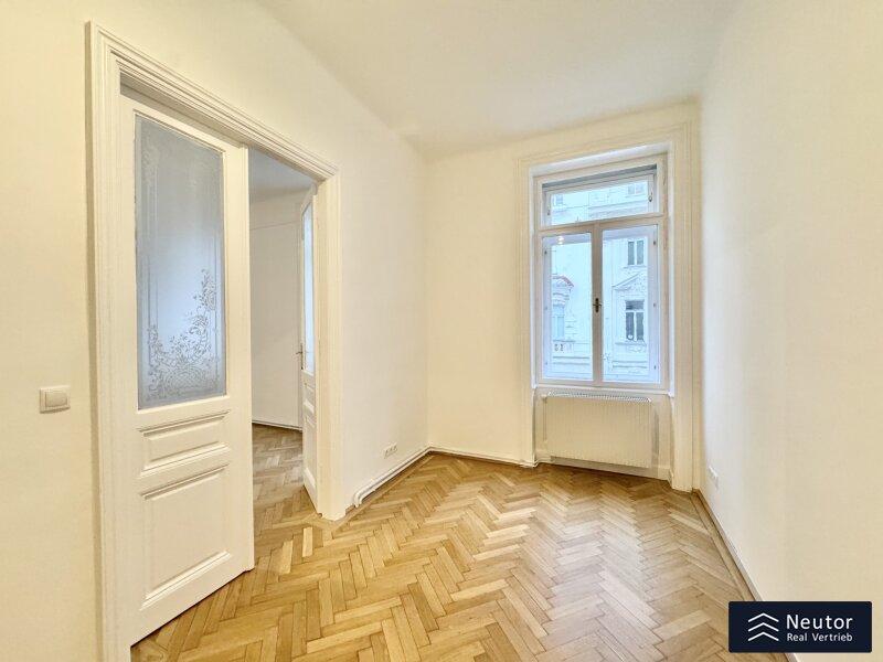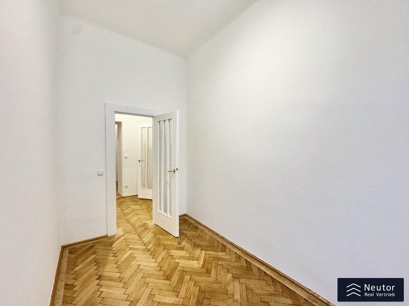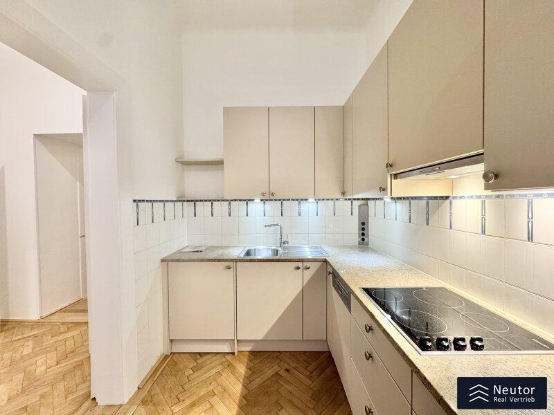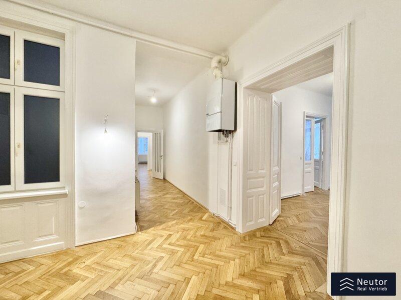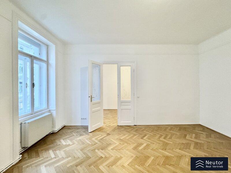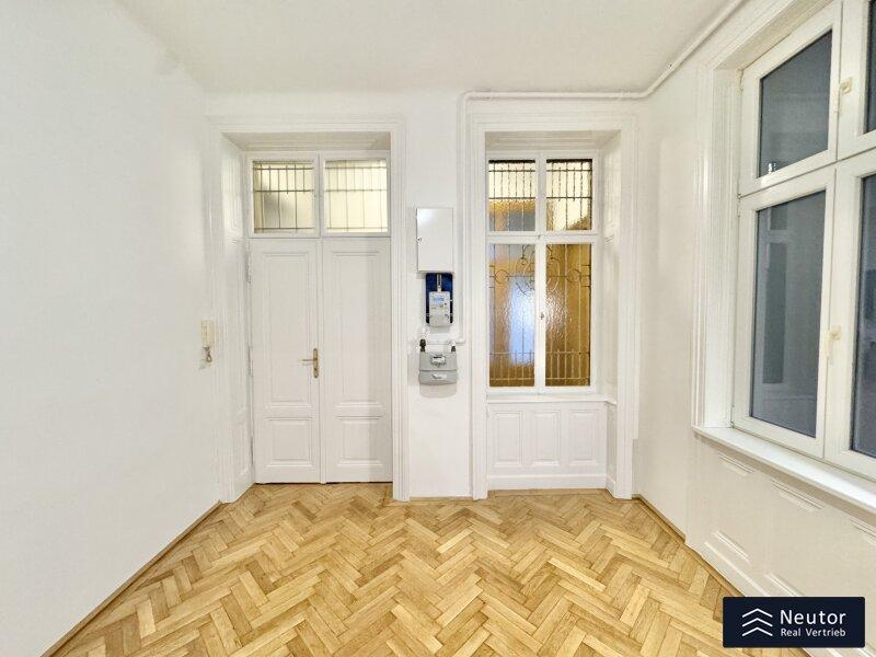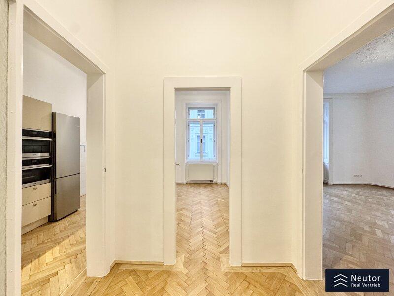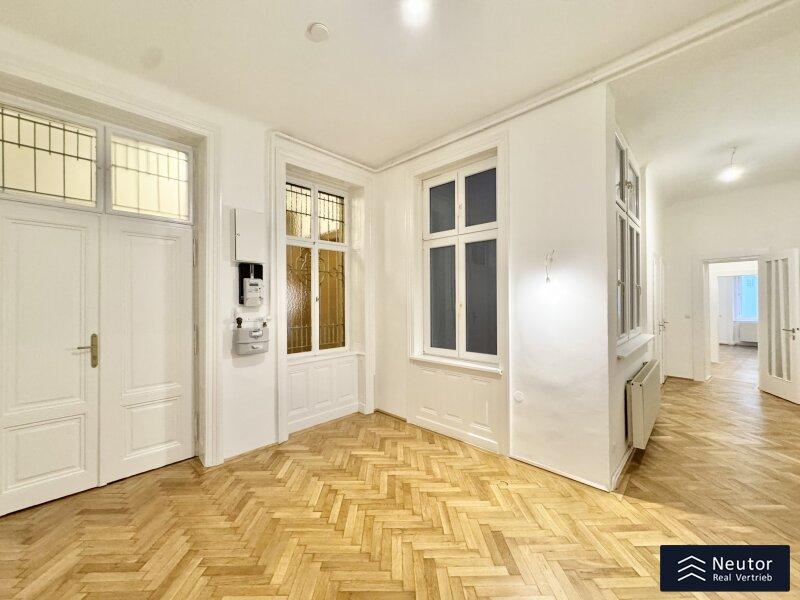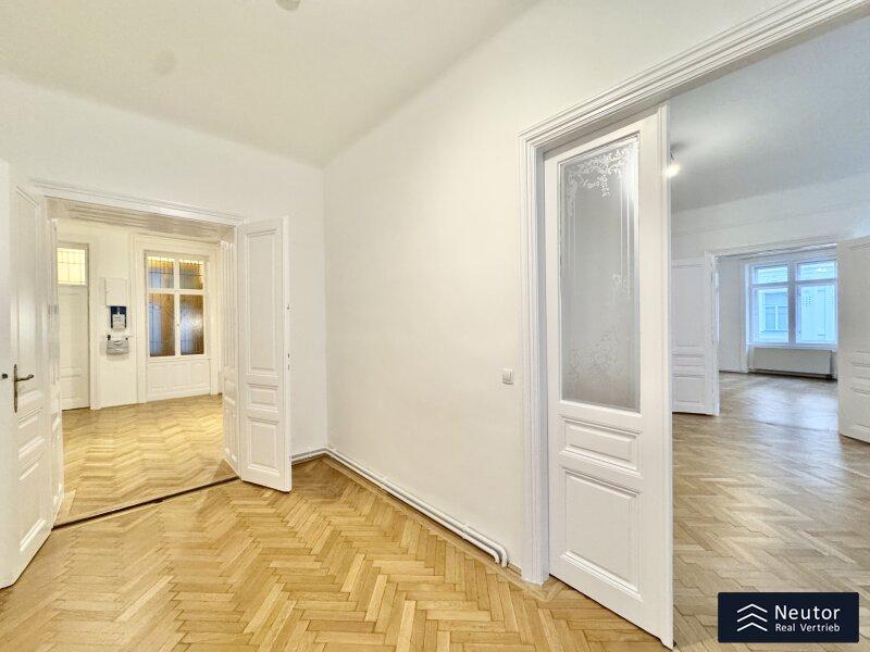 Das Staunen beginnt bei diesem Stilaltbau bereits vor der reich gegliederten Fassade und dem repräsentativen Eingangsbereich, welcher sich im wunderschönen Originalzustand präsentiert. Bequem gelangen Sie per Lift in das 2. Regelgeschoss, von welchem aus Sie nur mehr wenige Schritte von der großzügigen 4-Zimmerwohnung trennen. Die Wohnung wurdevor wenigen Jahren aufwendig teilsaniert und revitalisiert und besticht durch edlen Fischgrätparkett, welcher nahtlos durch die Räume verlegt ist, Kassettentüren, hohe Räume, alles Stilelemente was einen schönen Altbau ausmachen. Sie betreten Ihre neue Wohnung über einen großzügigen Vorraum, welcher ausreichend Platz für eine Garderobe bietet. Von diesem aus gelangen Sie in das Kabinett und zur Küche. Ebenso erreichen Sie das separate WC sowie dem kompakten Badezimmer mit Dusche. Die Einbauküche wurde separat angelegt und lädt förmlich zum Kochen ein. Diese wurde mit Marken-Geräten ausgestattet und kann ebenso mit einem kleinen Balkon punkten - beeindruckenden Ausblick auf den tiefen Graben und die Wipplingerstraße inklusive. Kreisförmig angelegt, erreichen Sie weiteren Räume dieser 4 Zimmerwohnung. Blickfang garantiert im Eck-Wohnzimmer der große formschöne Kachelofen, der in den Wintermonaten eine wohlig warme Wärme in diesen Wohntraum zaubert. Im Sommer hilft Ihnen die installierte Klimaanlage im Wohnzimmer einen kühlen Kopf zu bewahren. Eine tolle Wohnung in bestens angebundener Lage!