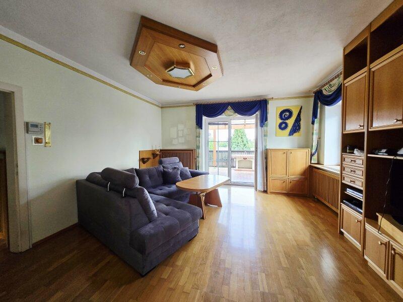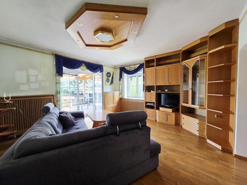 4 Zimmer, darunter ein helles Wohnzimmer mit Ausgang zur überdachten Terrasse mit Gartenblick