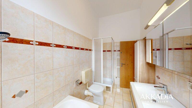 Badezimmer mit Doppelwaschbecken, Badewanne, Dusche und WC