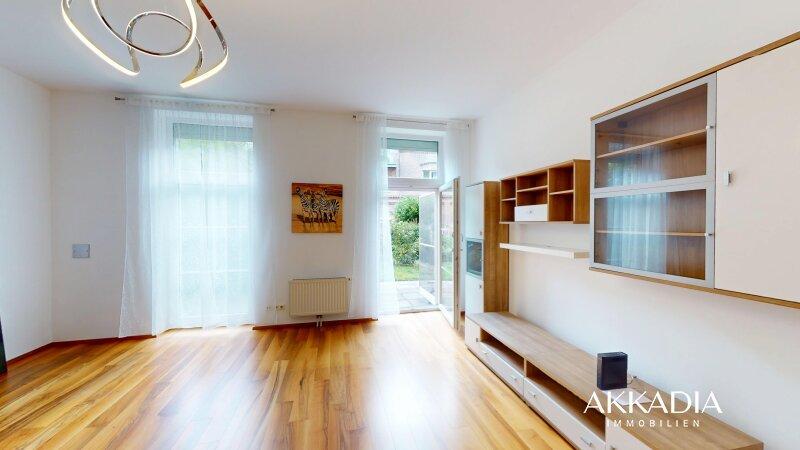 Großzügiges Wohnzimmer mit direktem Zugang zur Terrasse und zum kleinen Garten