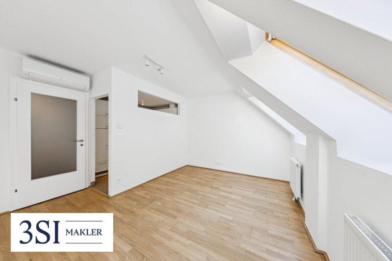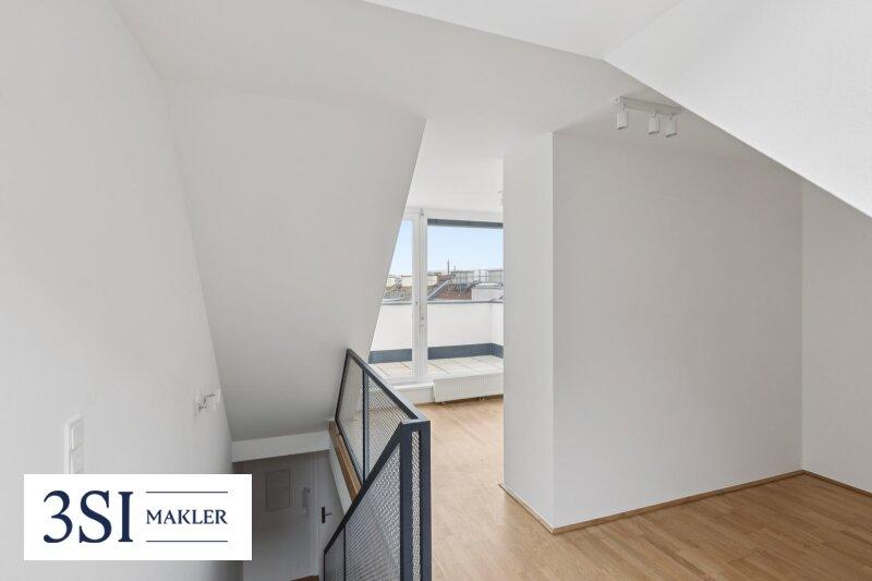Die untere Ebene empfängt mit einem einladenden Vorraum und führt in den offen gestalteten Wohnbereich mit integrierter Küche, der durch seine Helligkeit und Großzügigkeit besticht. Ein modernes Badezimmer mit Dusche sowie eine separate Toilette sorgen für zusätzlichen Komfort. Über eine innenliegende Treppe gelangt man auf die obere Ebene, die mit einer offenen Galerie vielseitige Nutzungsmöglichkeiten bietet. Die angrenzende Terrasse lädt zum Entspannen ein und rundet dieses attraktive Wohnangebot im Dachgeschoss perfekt ab.