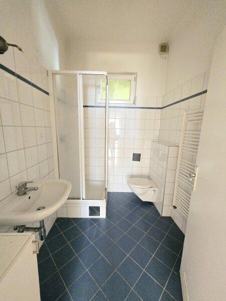 Badezimmer mit Dusche, Handwaschbecken, Handtuchheizung, Waschmaschinenanschluss und WC