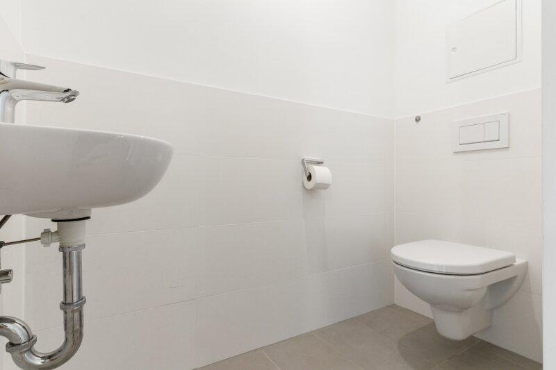 Das moderne Badezimmer mit Badewanne, Doppelwaschbecken und Waschmaschinenanschluss lädt zum Entspannen ein. Das separate WC sorgt für zusätzlichen Komfort im Alltag.