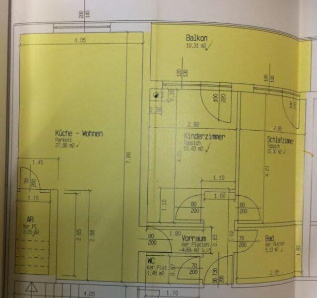 Die drei immerwohnung liegt im 1. Stock) und gliedert sich auf in eine Wohnküche sowie zwei Schlafzimmer, beide mit Balkon Zugang (10,31qm), Vorraum, Bad mit Wanne und separate Toilette. Die Wohnung ist ausgestattet mit Laminatboden und eine Hauszentralheizung.