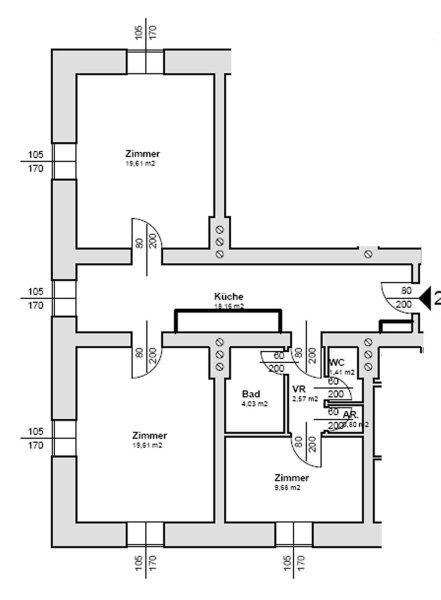 Die Wohnung besteht aus drei Zimmern, einer extra Küche, Bad, WC und Vorraum. Weiters ist ein großes Kellerabteil vorhanden. (Erdgeschoss)