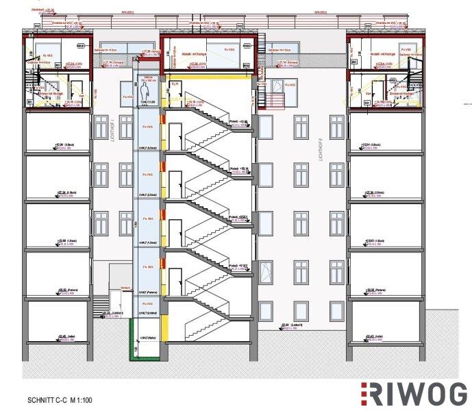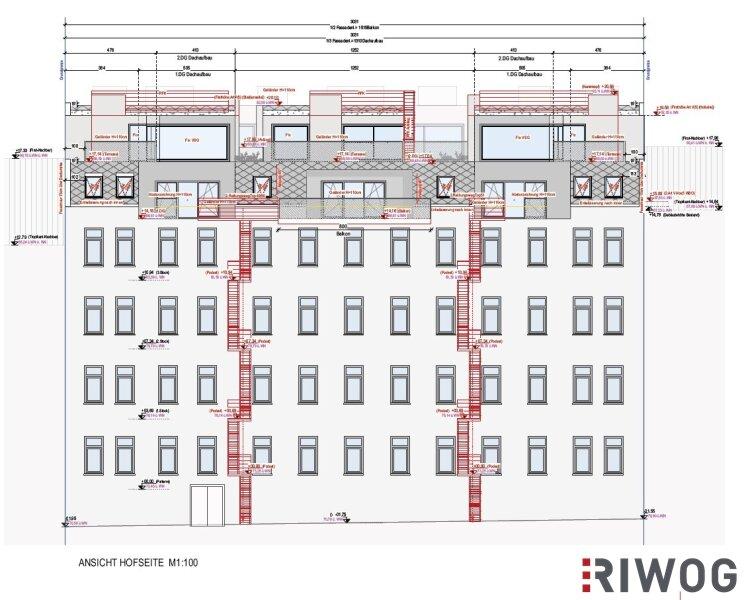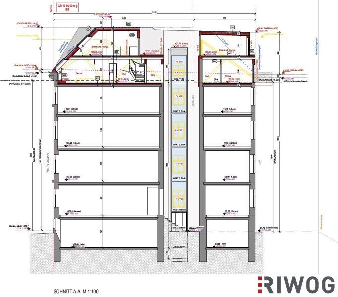 Gründerzeithause vor. Das Zinshaus verfügt über 5 Bestandsgeschoße plus KG. Die Planung umfasst insgesamt 7 Dachgeschoßwohnungen mit jeweils großzügigen Dachterrassen.