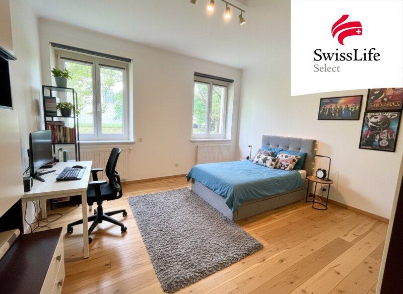 Das Wohnzimmer bildet das Herzstück der Wohnung und führt direkt in das rund 20 m² große Hauptschlafzimmer großzügig, ruhig und mit schönem Ausblick auf die Grünanlage.
