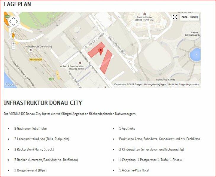 The Austria Vienna Center is located about 100 meters from the apartment and the Danube Island recreational area can be reached in about 3 minutes walk. The Vienna Donau City as modern urban development is located only 8 minutes from the Vienna historic city center, as well as next door to the Vienna United Nations (UN) Building. On the one hand it is a green oasis of the Viennese population due to its adjacent location on the Danube, Alte Donau, Kaiserwasser and the Lobau recreation area, on the other hand a modern location not far from the city center of Vienna with a very good connection: U1 to City Center - Shoping mall: Donau - Zentrum - DC etc. The Donaupark is located in the immediate vicinity as well as the historic beach resort Gänsehäufel. The proximity to universities and numerous schools, including the renowned Vienna International School, makes the apartments for families also very attractive. Numerous supermarkets and doctors in the direct environment also value this location. An incomparable leisure time can be found in the Danube Center with its more than 260 shops, a cinema with 13 rooms, restaurants, cafés and bars. The subway (U1) and tram stop (25) are within walking distance and the nearest motorway junction (A22) can be reached just as quickly. The airport Vienna-Schwechat is 17km or half an hour drive in distance.
