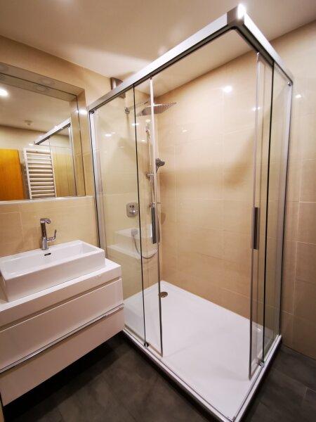 Das modernisierte Badezimmer beinhaltet jetzt eine große Dusche (Länge: 140 cm), einen großen Spiegel mit Ablagefläche, Spotlights und Glanzfliesen, Regenwaldbrause, eingebauter Spiegel, etc. Das WC ist separat.