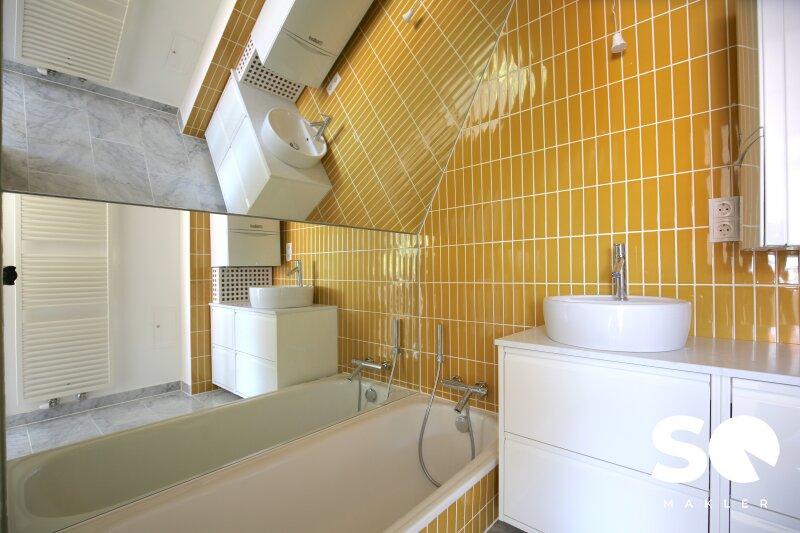Das Bad ist mit einer Badewanne ausgestattet und wird durch ein Deckenfenster mit natürlichem Licht durchflutet ideal für entspannte Stunden.