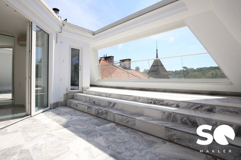 Genießen Sie auf der ca. 26 m² großen Terrasse einen atemberaubenden Blick ins Grüne. Der Weitblick Richtung Hügelpark und Küniglberg sorgt für eine einzigartige Atmosphäre.