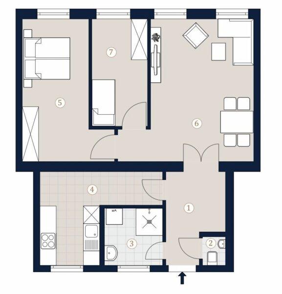 Die 3-Zimmer-Altbauwohnung mit einer Wohnfläche von ca. 66 m² teilt sich wie folgt auf: