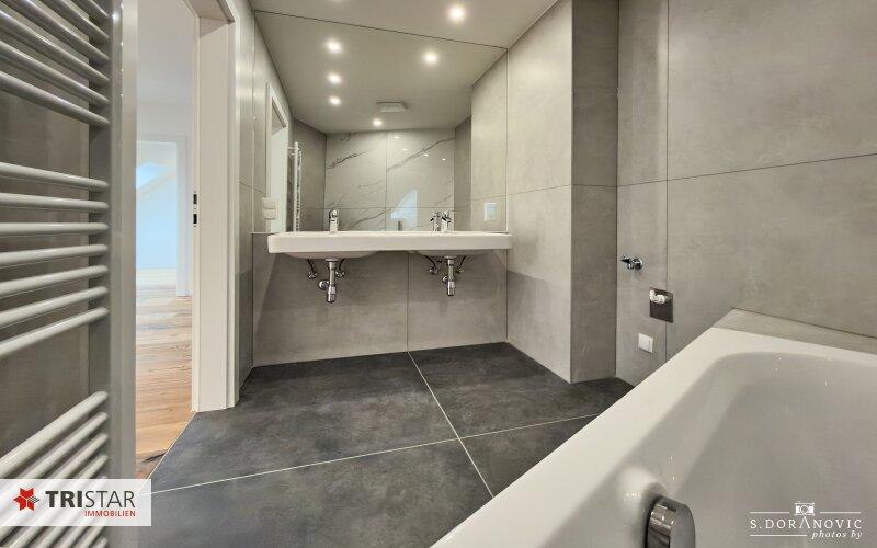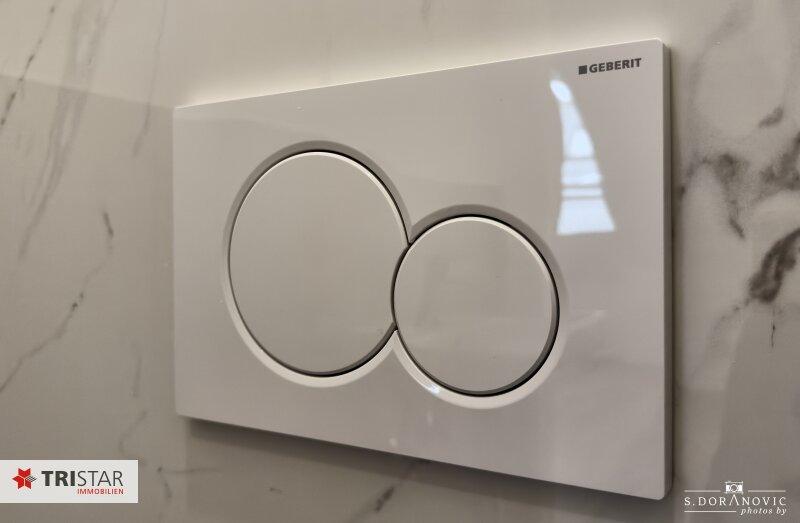 - Sanitär: Fußbodenheizung in Bädern, Wand-WC (Tiefspüler), Handwaschbecken (43x34 cm), Waschtisch (120x46 cm), Chrom-Armaturen, Duschkopf, Mischer, Handbrause.