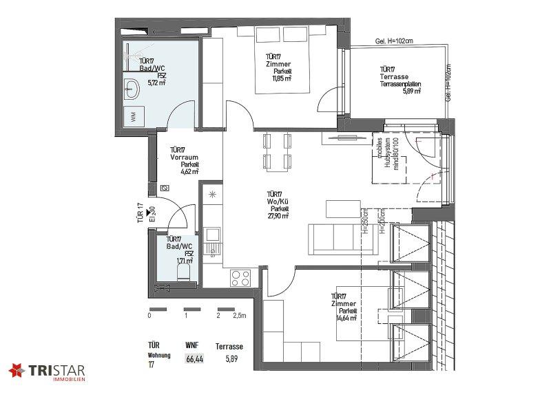 Top 17: WNFL ca. 66,44 m² (3 Zimmer) + Terrasse ca.6 m² + ER (Keller) ca. 2 m²