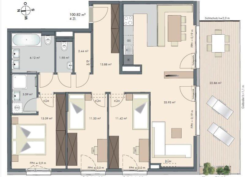 Die Wohnung besticht durch Ihre sehr gute Wohnraumaufteilung, sehr hochwertigen Ausstattung und Bauweise. Sie befindet sich im 7. Stock / Dachgeschoss und hat eine Wohnfläche von ca. 101 m² plus eine ca. 23m² große Terrasse, sowie ein Kellerabteil, einen Tiefgaragenplatz (optional), Fahrradabstellplatz, Fußbodenheizung und Klimaanlage.