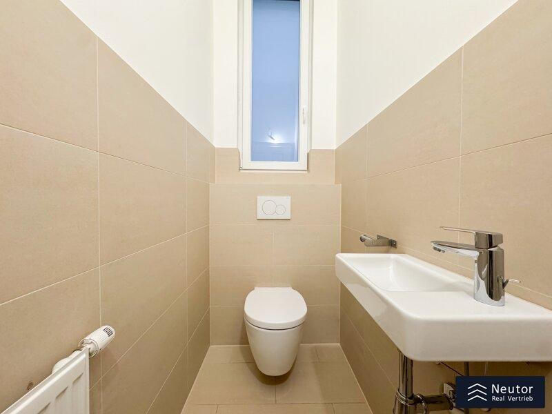 Entlang des weitläufigen Gangs liegen rechterhand ein großzügiger Abstellraum, ein separates WC, sowie eines der beiden stilvoll ausgestatteten Badezimmer. Dieses Badezimmer überzeugt mit hochwertiger, moderner Verfliesung und verfügt über eine komfortable Dusche sowie ein weiteres WC. Hier fügt sich zudem der Waschmaschinenanschluss ästhetisch in das Gesamtbild ein.