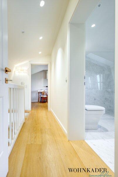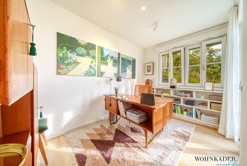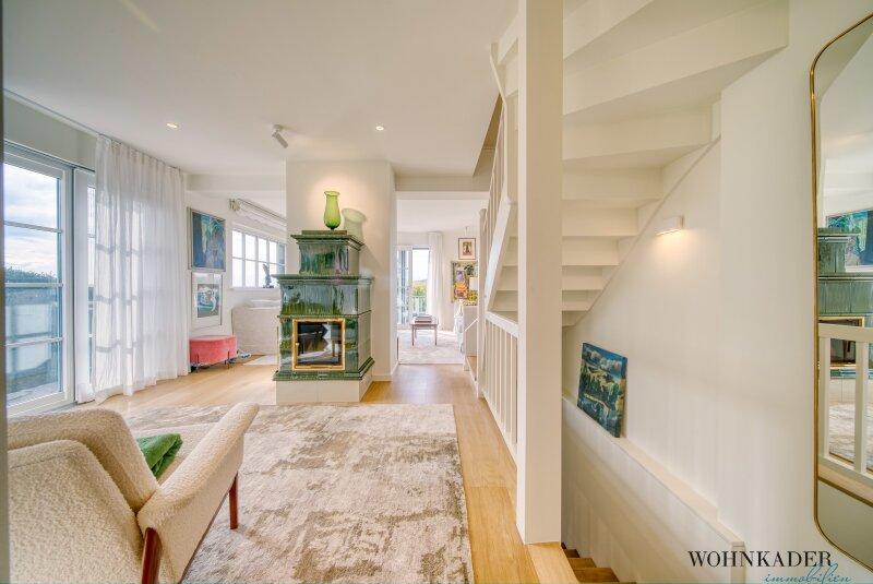 Eine repräsentative Treppe führt in die nächste Wohnebene, die über einen separaten Hauseingang verfügt. Hier erwarten Sie ein weitläufiger Vorraum mit eleganter Garderobe, ein Gäste-WC mit Handwaschbecken, ein stilvolles Büro mit Blick auf die idyllischen Weinberge sowie ein großzügiger Wohnsalon mit edlem Kamin. Von hier aus gelangen Sie auf die traumhafte Panoramaterrasse ein Ort der Ruhe und Inspiration mit einem unvergleichlichen Ausblick über die umliegende Natur. Bodentiefe Fenster schaffen eine harmonische Verbindung zwischen Innen- und Außenbereich und durchfluten den Raum mit Licht.
