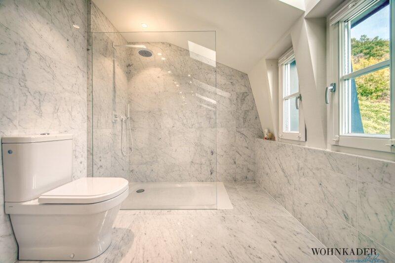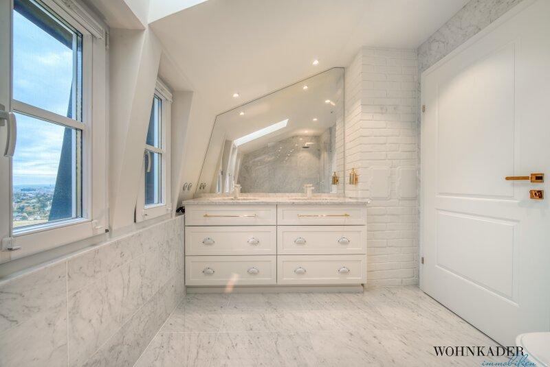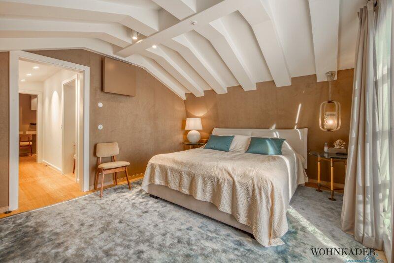 Die oberste Etage bietet zwei separat begehbare Schlafbereiche. Einer davon verfügt über eine private Terrasse mit atemberaubender Aussicht. Auf derselben Ebene befindet sich das exklusive Luxus-Badezimmer, ausgeführt in edlem Marmor und mit hochwertigen Armaturen ausgestattet.