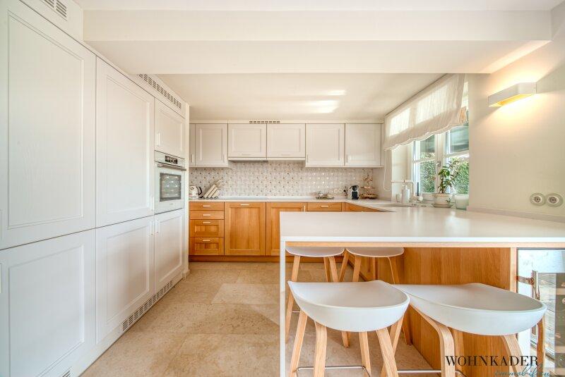 Die untere Etage beeindruckt mit einer großzügigen, modernen Designküche, die über den privaten Eingang von der Terrasse aus erreichbar ist. Direkt angrenzend befindet sich ein praktischer Abstellraum, ebenfalls mit Zugang von der Terrasse.