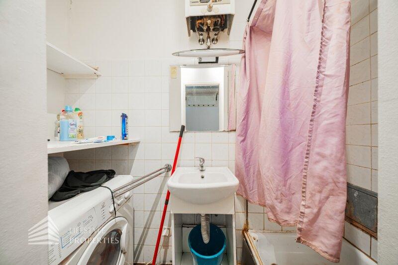 Die Raumaufteilung ist kompakt und gut durchdacht. Die Wohnung besteht aus einem Vorraum, einem getrennten Badezimmer und einer separaten Toilette sowie einem offenen Wohn-Ess-Bereich mit einer modernen Einbauküche. Große Fensterflächen sorgen für eine besonders helle, freundliche Wohnatmosphäre und unterstreichen den Altbaucharme der Immobilie. Die vorhandene Küche bleibt in der Wohnung und ist im Kaufpreis inkludiert. Beheizt wird die Wohnung derzeit über eine Elektroheizung.