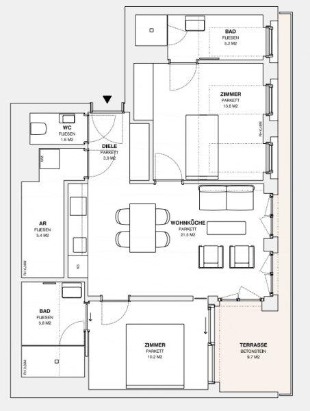 ++ Bei den hier dargestellten Fotos handelt es sich um ähnliche, bereits fertiggestellte Wohnungen des selben Projektentwicklers. Aktuelle Bilder des Projektes MOLLARD50 werden nächste Woche nachgereicht. Der dargestellte Plan/Grundriss ist der der tatsächlichen Wohnung +++