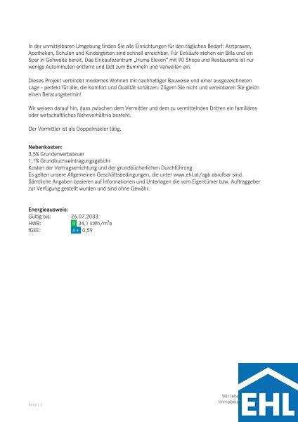 In der unmittelbaren Umgebung finden Sie alle Einrichtungen für den täglichen Bedarf: Arztpraxen, Apotheken, Schulen und Kindergärten sind schnell erreichbar. Für Einkäufe stehen ein Billa und ein Spar in Gehweite bereit. Das Einkaufszentrum Huma Eleven mit 90 Shops und Restaurants ist nur wenige Autominuten entfernt und lädt zum Bummeln und Verweilen ein.