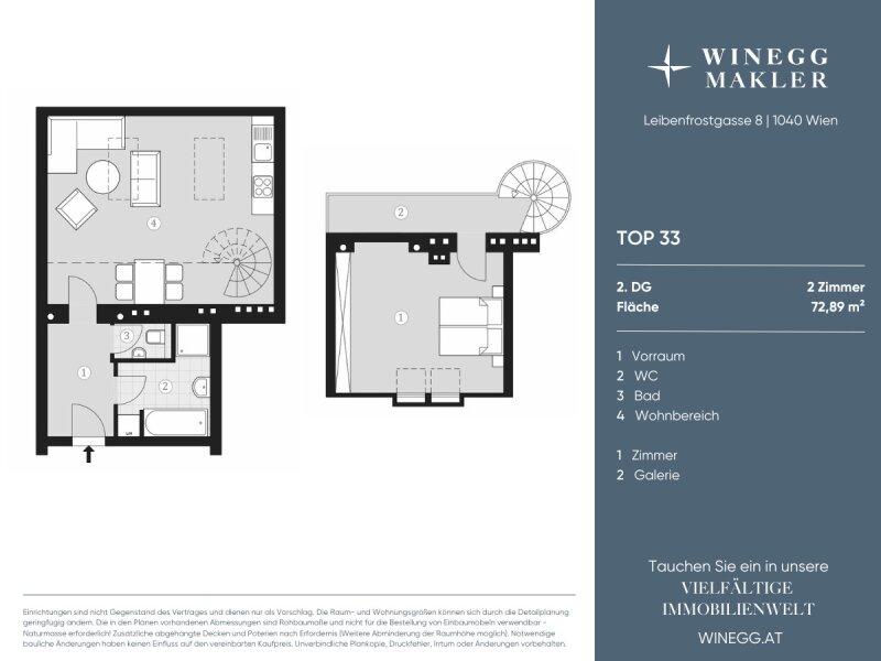Die Wohnung im 2. Dachgeschoß wurde modernisiert und hochwertig ausgestattet, sie besticht durch ihren durchdachten Grundriss und teilt sich auf 2 Etagen wie folgt auf: