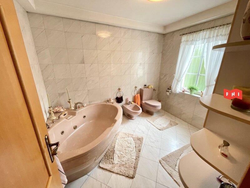 OG: Vorraum, 2 geräumige Schlafzimmer eines davon mit großzügiger begehbarer Garderobe (ca. 31,26m² & 16m²), Bibliothek oder Kinderzimmer (ca. 11,68m²) zwei Fliesenbäder eines mit Eckbadewanne, Bidet u. WC, sowie eines mit Dusche u. WC, Treppenaufgang auf den Dachboden
