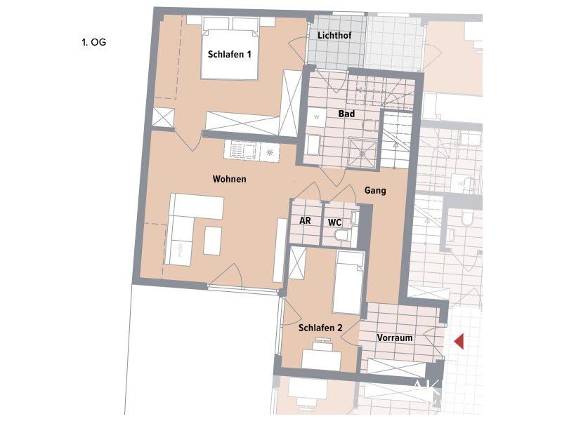 Im 1. Obergeschoss befinden sich der Wohn-/Ess-/Kochbereich, zwei separat begehbare Schlafzimmer, ein Badezimmer, ein separates WC, ein Abstellraum, ein Gang sowie ein Vorraum. Ein Lichthof sorgt für zusätzliche Belichtung und eine angenehme Wohnatmosphäre.