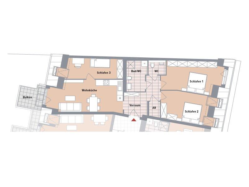 Top 13 in Haus 1 befindet sich im 3. Obergeschoss und überzeugt durch eine großzügige Raumaufteilung sowie einer attraktiven Freifläche.