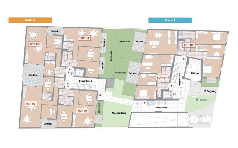Top 2 in Haus 1 überzeugt als besonders großzügige Gartenwohnung mit durchdachtem Grundriss und hoher Wohnqualität.