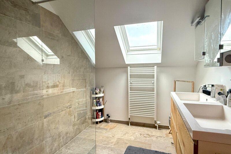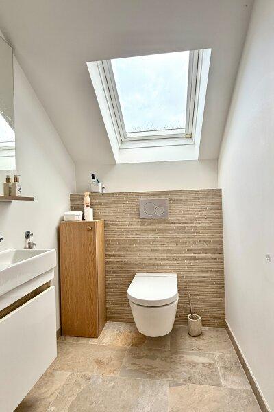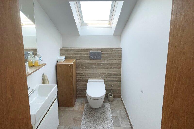 Zwei stilvoll gestaltete Bäder und zwei WCs, jeweils im EG und OG, sorgen für den nötigen Komfort und ermöglichen es, dass sich auch größere Familienmitglieder oder Gäste jederzeit wohlfühlen. Die geschmackvolle Ausstattung der Bäder mit Fliesen und Steinoptiken verleihen dem Haus eine elegante Note.