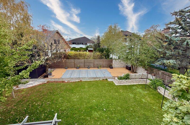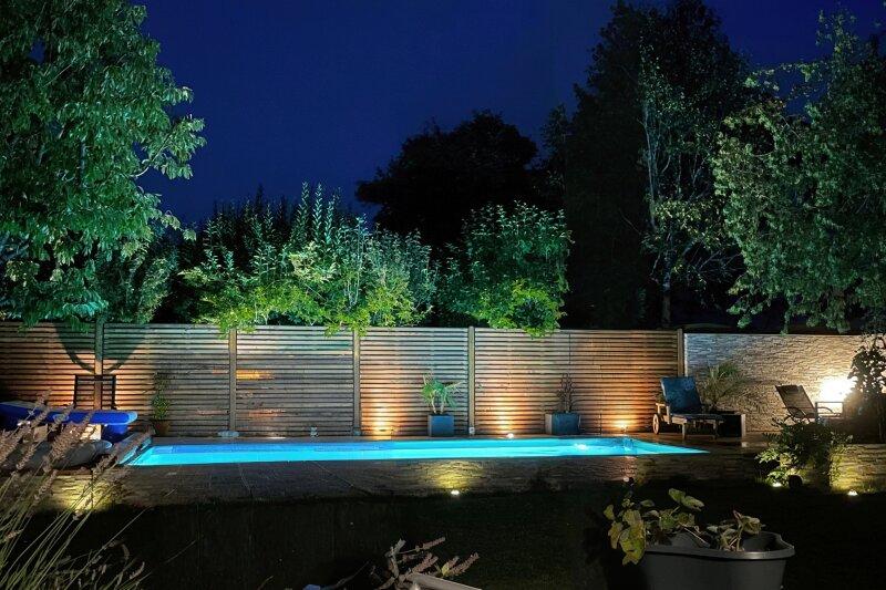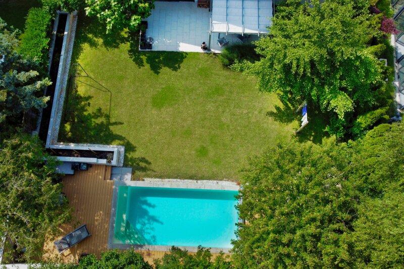 Der Gartenbereich wurde 2020 völlig neu gestaltet: Komplette Gartenbewässerung inkl. Sickerschacht, Pool-Landschaft mit einem 34.000 Liter Salzwasserpool und Wärmepumpe. Die Pooltechnik ist bequem zugänglich in einem Gerätehaus verbaut.