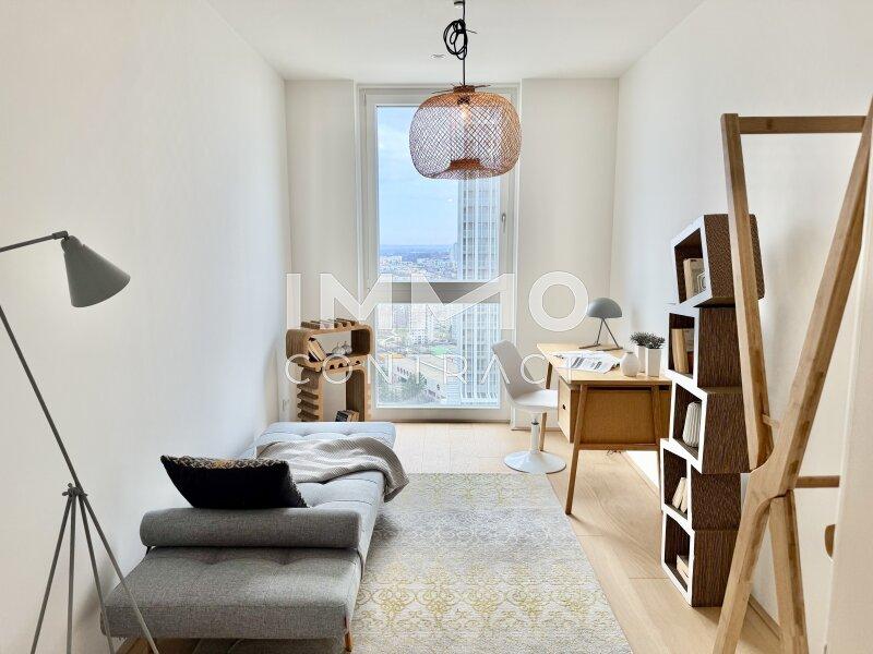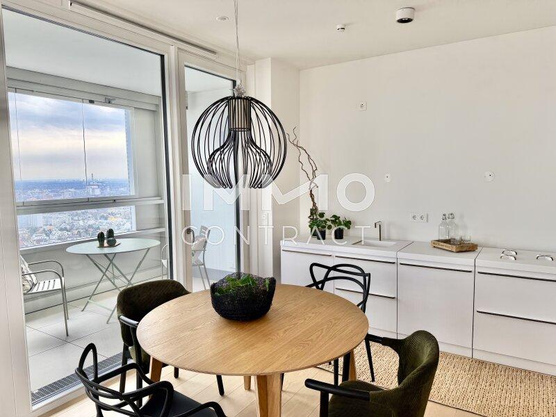 Im Wohnturm befinden sich rund 300 Wohnungen in unterschiedlichen Größen, aufgeteilt in vier Ausstattungskategorien. Die wenigen noch verfügbaren Einheiten verfügen über 2-4 Zimmer und sind zwischen ca. 46 m² - ca. 215 m² groß. Sämtliche der verfügbaren Eigentumswohnungen befinden sich im 22. 32. Stockwerk und überzeugen mit der hochwertigen Ausstattungslinie Sky Living (22. - 30. OG), wobei sich die Penthouse-Etagen (31. - 32. OG) nochmals in Ihrer Beschaffenheit abheben.