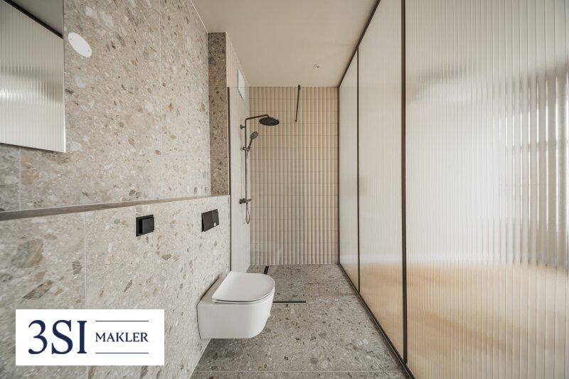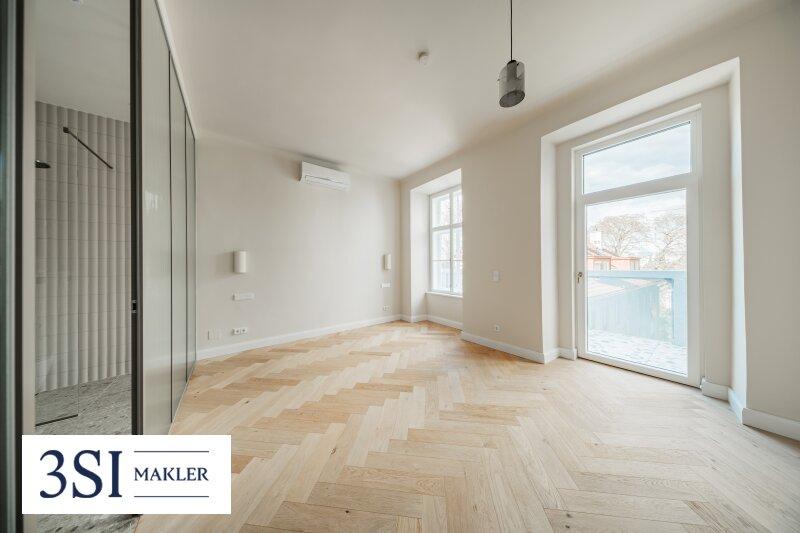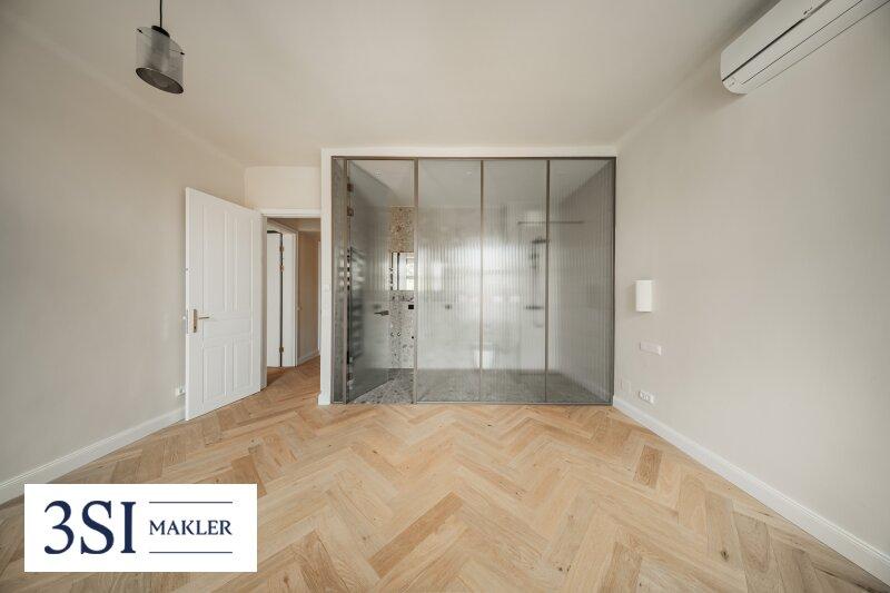 Master-Bedroom (ca. 18 m²) mit en suite-Badezimmer, abgetrennt durch eine stilvolle Glaswand, ausgestattet mit Dusche und WC, sowie direktem Zugang zum Nordwest-Balkon mit Blick Richtung Karlskirche.