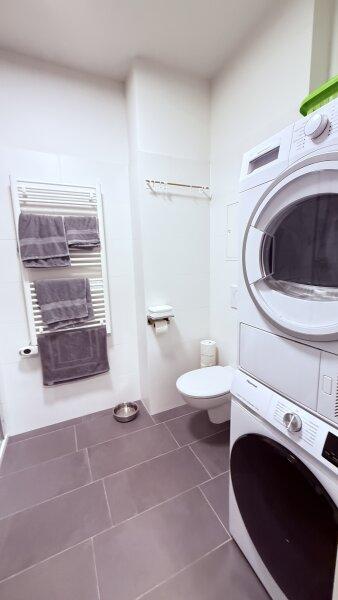Badezimmer mit Dusche, WC und Waschmaschinenanschluss