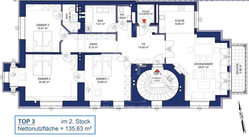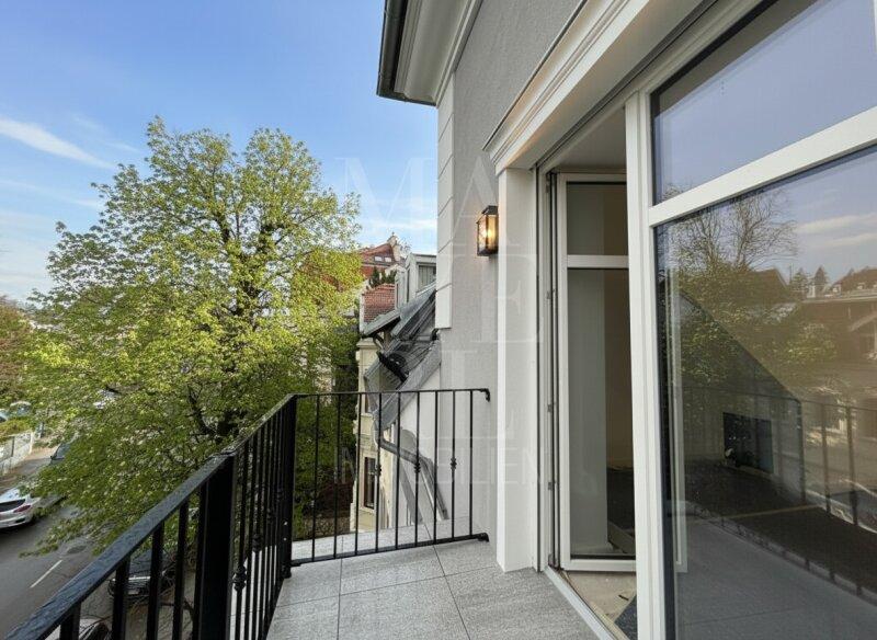 Vorraum, großzügiges Wohn-/Esszimmer mit offen gestalteter, voll ausgestatteter Küche sowie Ausgang auf den Balkon. Drei flexibel nutzbare Zimmer mit Größen zwischen ca. 16 m² und 24 m², davon eines mit eigenem Duschbad samt WC. Zusätzlich steht ein weiteres, hochwertig ausgestattetes Badezimmer mit Badewanne und Doppelwaschtisch sowie ein separates WC zur Verfügung.