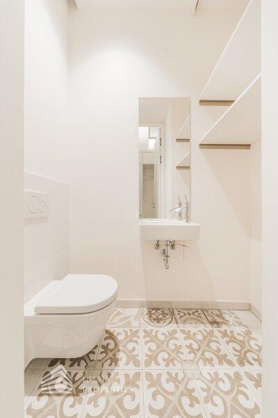 Der Vorraum erstreckt sich über eine Fläche von ca. 2,5 m². Rechter Hand vom Vorraum befindet sich die separate Toilette und das ca. 8,88 m² große Badezimmer. Das Bad ist mit einem Waschbecken, einer Badewanne und einer Toilette ausgestattet. Das verflieste Badezimmer ist mit geschmackvollen, weißen Fliesen gestaltet. Der graue Boden bildet einen schönen Akzent und verleiht dem Raum einen modernen Touch.