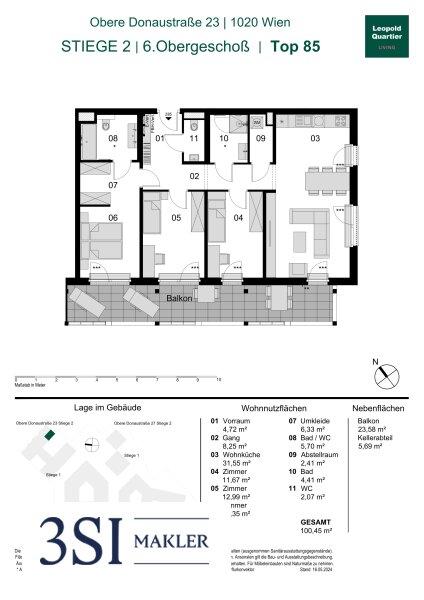Diese moderne Wohnung befindet sich im 5. Obergeschoß. Die Einheit verfügt über eine Wohnnutzfläche von insgesamt 100,45 m² und bietet zusätzlich einen Balkon mit 23,58 m².