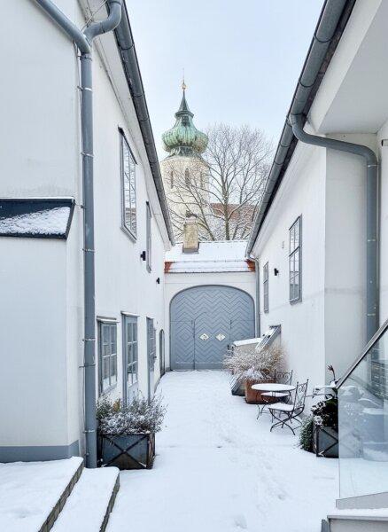 Schon der Zugang in den Innenhof ist beeindruckend - Altes und Neues passen hervorragend zusammen. Dreht man sich um, ergibt sich der Blick Richtung Kirchturm, der im gesamten Ensemble eingebettet zu sein scheint.