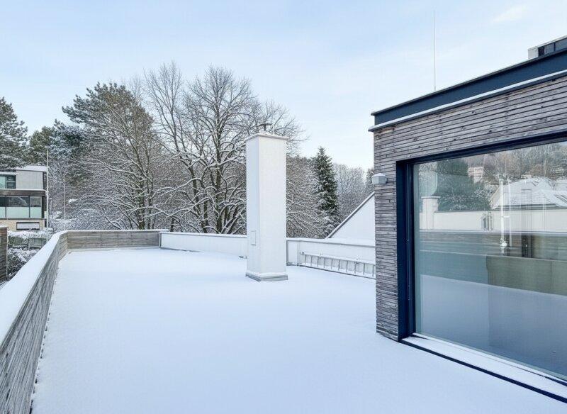 Desweiteren gibt es auch auf dieser Etage ein separates WC, welches sich am Aufgang zur ca. 92 m2 großen Terrasse befindet. Die Terrasse bietet aufgrund ihrer Größe Platz für alles, wovon man Outdoor träumen kann. Richtung Norden wird der Blick von den umliegenden Bäumen geleitet, Richtung Süden kommt erneut der Kirchturm ins Blickfeld.