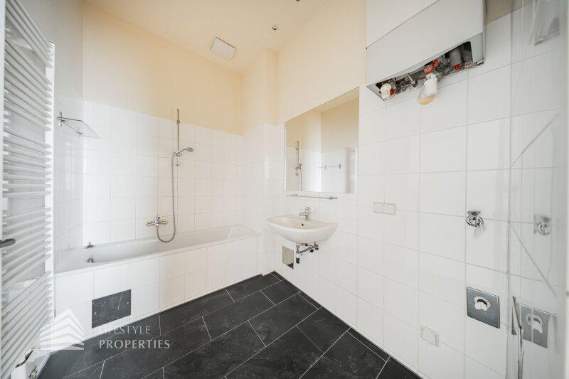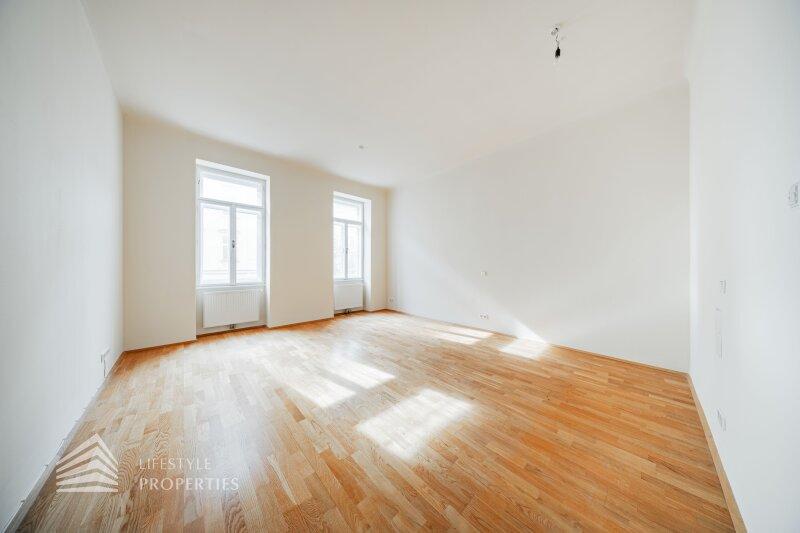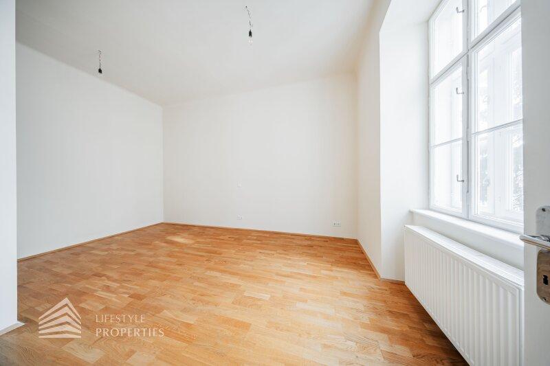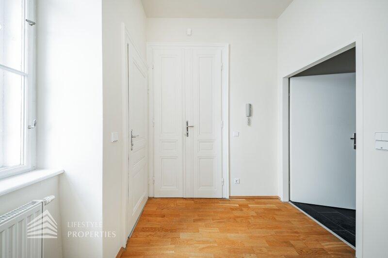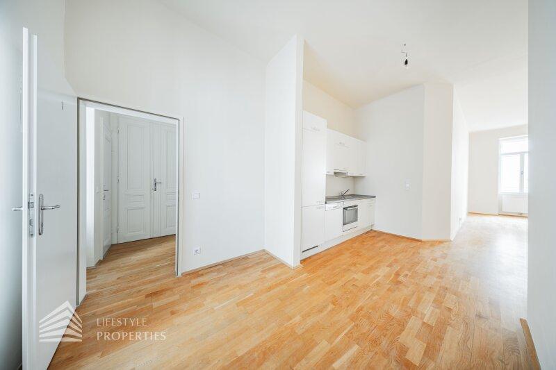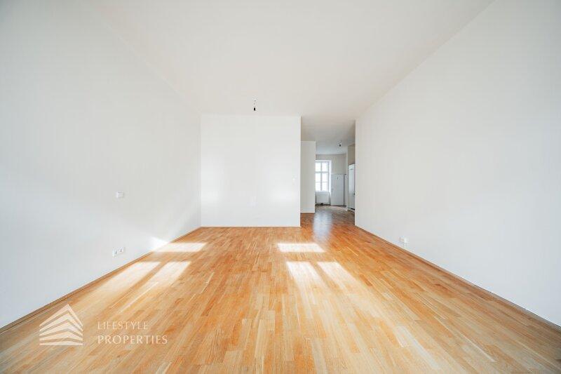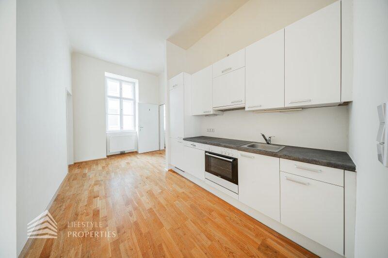 Beim Betreten der Wohnung gelangt man in den ca. 6 m² großen Vorraum, von dem aus das separate WC (ca. 2 m²) mit Fenster, das ca. 5 m² große Badezimmer mit Badewanne und Waschmaschinenanschluss sowie die großzügige Wohnküche direkt erreichbar sind. Die loftartige Wohnküche erstreckt sich über ca. 41 m² und ist sowohl hofseitig als auch straßenseitig in die verkehrsberuhigte, helle Hainburger Straße ausgerichtet. Dank der offenen Gestaltung wirkt der Raum besonders weitläufig und einladend. Die hochwertig ausgestattete Küchenzeile fügt sich harmonisch in den Wohnbereich ein und bietet viel Platz für geselliges Kochen und gemütliches Beisammensein. Das ca. 17 m² große Schlafzimmer, das über die Wohnküche zugänglich ist, bietet mit seiner ruhigen, nordöstlichen Ausrichtung in den Innenhof eine ideale Rückzugsmöglichkeit. Hier lassen sich mühelos ein komfortables Kingsize-Bett, ein großer Einbauschrank oder sogar eine Home-Office-Ecke unterbringen.