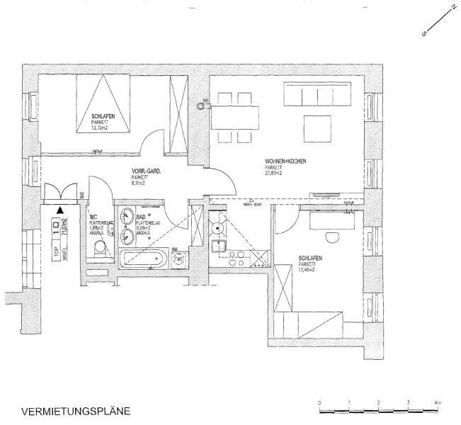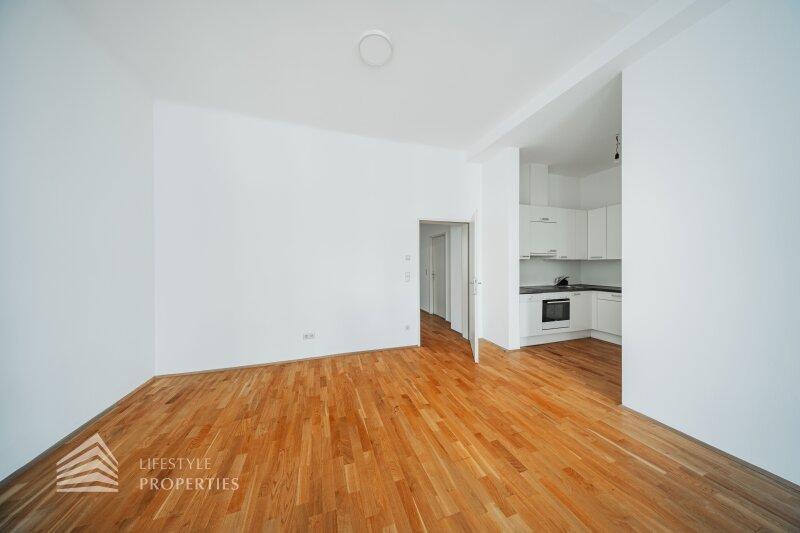 Bei Betreten der Wohnung gelangen Sie in den ca. 8 m² großen Eingangsbereich, von welchem Sie links das ca. 14 m² große Schlafzimmer und gerade durch das ca. 28 m² Wohnzimmer mit voll ausgestatteter Wohnküche erreichen. Das ca. 6 m² voll ausgestattete Badezimmer sowie das separate WC, erreichen Sie ebenfalls über den Vorraum. Vom Wohnzimmer gelangen in ein weiteres ca. 13 m² großes Schlafzimmer. Ein Balkonzubau ist möglich.