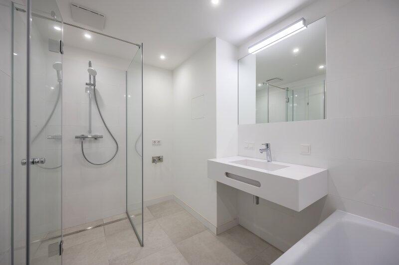 Modern verflieste Nassräume mit Markenarmaturen