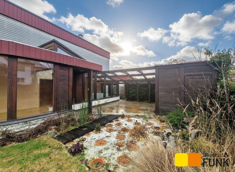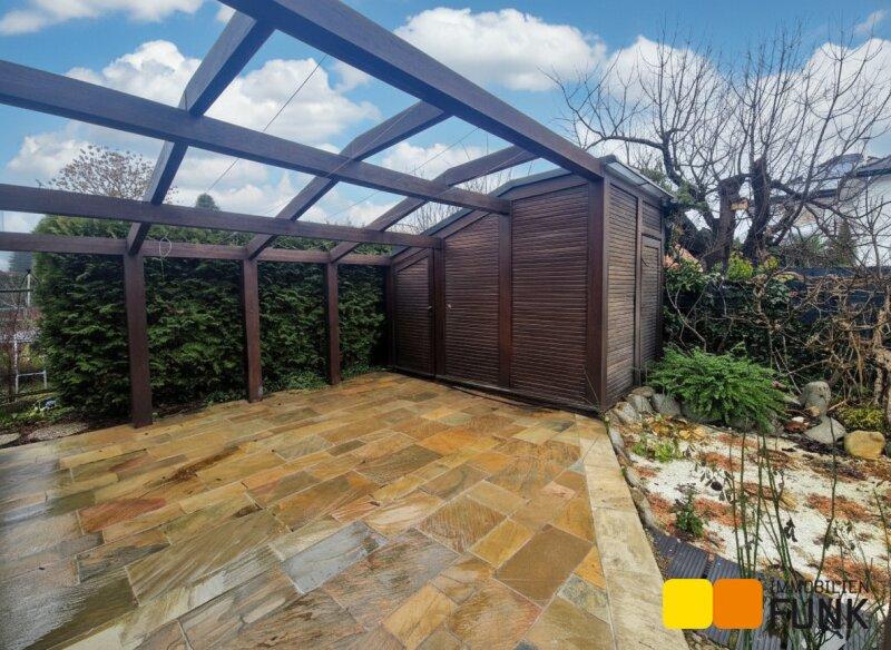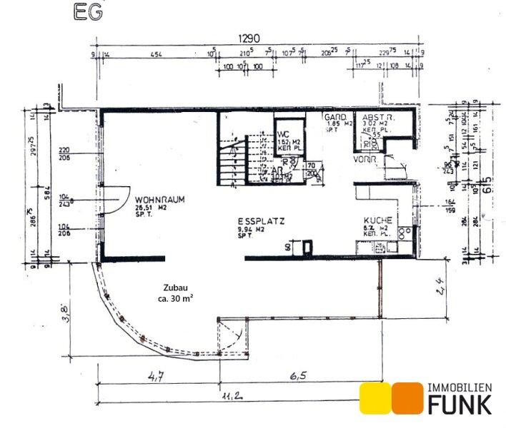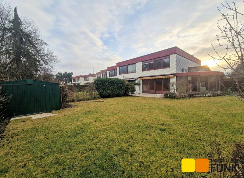 Das im Jahr 1980 in Ziegelmassivbauweise errichtete Siedlungsreihenhaus präsentiert sich in leicht renovierungsbedürftigem, aber gepflegtem Zustand. Es wurde im Jahr 1989/90 durch einen bewilligten, gartenseitigen Zubau mit einem etwa 30 m² großen Wintergarten erweitert. So beträgt die gesamte Wohnfläche nun großzügige ca.156 m². Zusätzlich wurden im Garten noch ein Holznebengebäude und ein Geräteschuppen errichtet.