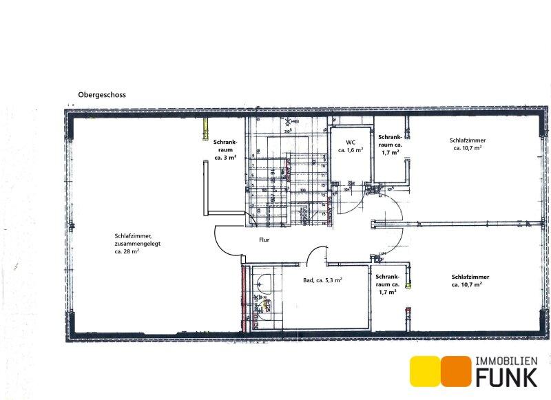 - Obergeschoss: ca. 62 m² (Flur, 3 Schlafzimmer mit je einem begehbaren Schrank, WC, Badezimmer)