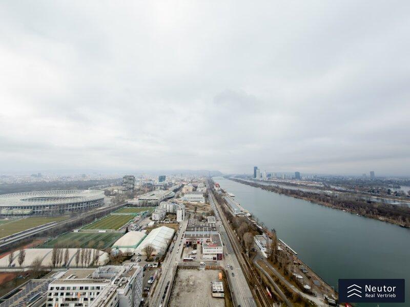 Willkommen in der atemberaubenden Luxusimmobilie "Marina Tower". Diese exklusive Wohnung befindet sich im 32. Stockwerk auf einer Höhe von 110 Metern und bietet Ihnen einen unvergleichlichen Fernblick über Wien. Mit hochwertigem Umbau, einem optionalen Tiefgaragenstellplatz, Deckenkühlung, Fußbodenheizung und edlem Parkettboden erleben Sie hier ein unvergleichliches Wohngefühl und ein außergewöhnliches Ambiente. Die ausgezeichnete Lage in der Nähe der U-Bahn-Station U2 Donaumarina ermöglicht Ihnen in wenigen Minuten die Innenstadt zu erreichen. Die 3 großzügig Räume mit dem Wohn-und Essbereich als Herzstück der Wohnung mit direktem Zugang zum Balkon bietet die perfekte Mischung aus Eleganz und Komfort. Ein zusätzlicher Abstellraum sorgt für Stauraum und Ordnung. Für Ihre Gäste steht ein separates WC mit Handwaschbecken zur Verfügung, welches absolute Privatsphäre garantiert. Die 2 Badezimmer dieser Immobilie sind wahre Highlights. Das erste Badezimmer beeindruckt mit einer begehbaren Dusche und einem Ankleidebereich, der direkt mit dem Schlafzimmer verbunden ist. Das zweite Badezimmer bietet eine luxuriöse Badewanne und eine weitere begehbare Dusche, ebenfalls mit direktem Zugang zum Schlafzimmer. Beide Badezimmer sind mit wunderschönen dunkelgrünen Fliesen ausgestattet, die Eleganz und Raffinesse ausstrahlen. Der großzügig gestaltete Wohn- und Essbereich besticht durch seine moderne Ausstattung. Sie gelangen vom Schlafzimmer sowie vom Wohn-und Essbereich auf den Balkon und die Loggia, von wo aus Sie einen spektakulären Blick auf die Donau und das Ernst-Happel-Stadion sowie über die Stadt genießen können. Solch grandiose Sonnenuntergänge haben Sie wahrscheinlich noch nie gesehen. Große Fensterfronten sorgen für viel Licht und schaffen eine lichtdurchflutete Atmosphäre. Die 2 Schlafzimmer sind mit edlem Parkettboden ausgelegt und bieten Ihnen einen ruhigen Rückzugsort für erholsamen Schlaf und pure Entspannung. Dank der Fußbodenheizung genießen Sie das ganze Jahr über angenehme Wärme und Behaglichkeit. Das Apartment befindet sich im 32. Stockwerk und bietet Ihnen einen atemberaubenden Ausblick über die Stadt. Hier erleben Sie das Gefühl von Freiheit und Exklusivität, das nur eine solch hochwertige Immobilie bieten kann.