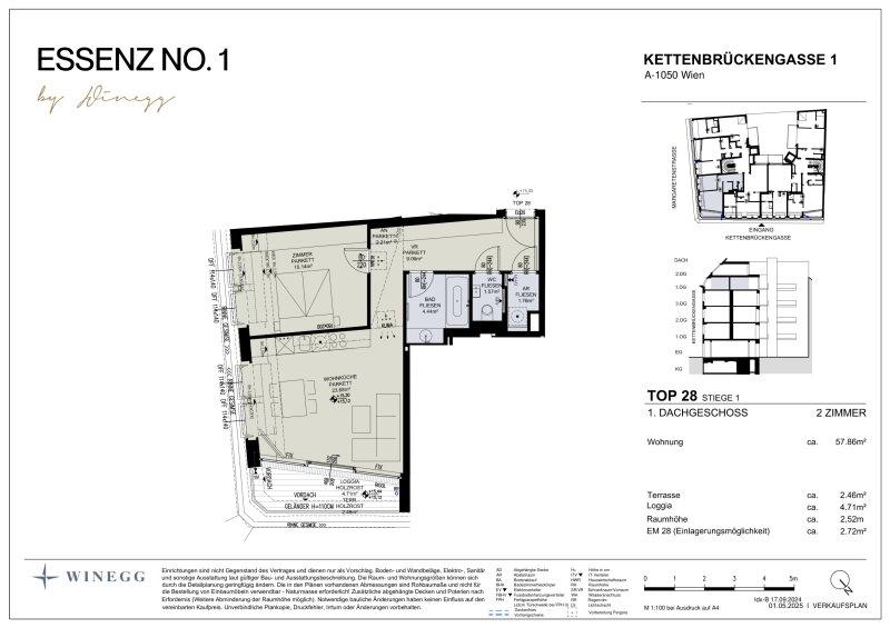 Die 2-Zimmer-Wohnung befindet sich im 1. Dachgeschoss und bietet eine Wohnfläche von ca. 58 m² und eine Loggia mit ca. 7 m². Alle Zimmer sind separat begehbar. Die Raumaufteilung gliedert sich wie folgt: