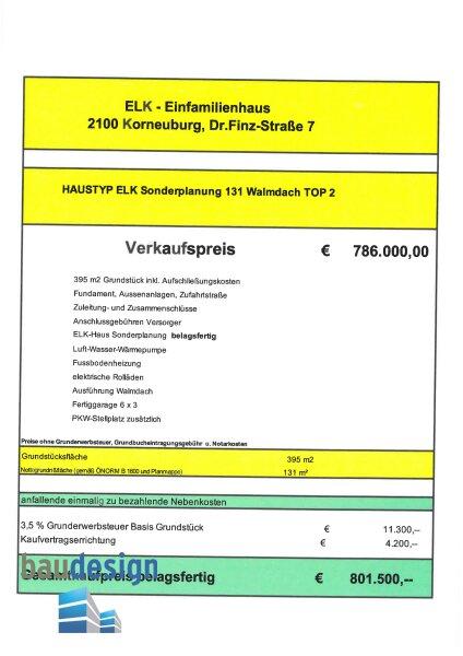 Kaufpreis: € 786.000,-- inklusive Aufschließungskosten und Anschlussgebühren